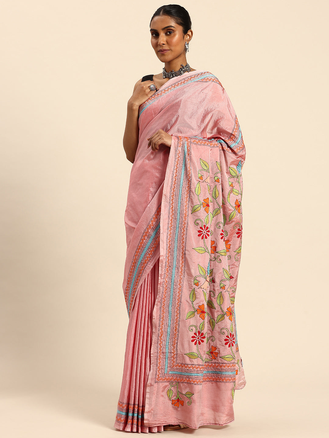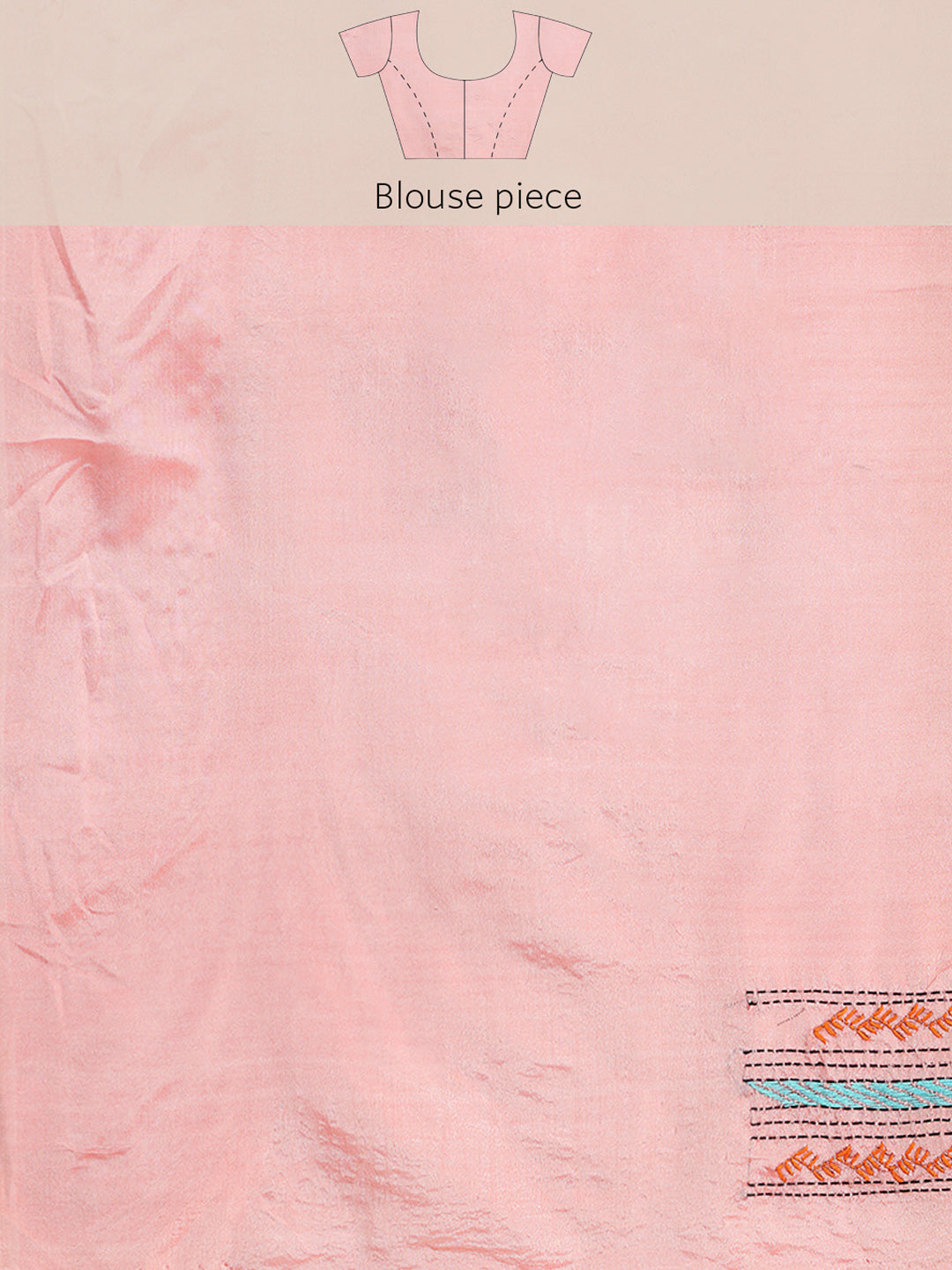 ArtEastri Light Pink Art Silk Kantha Stitch Saree With Blouse Piece