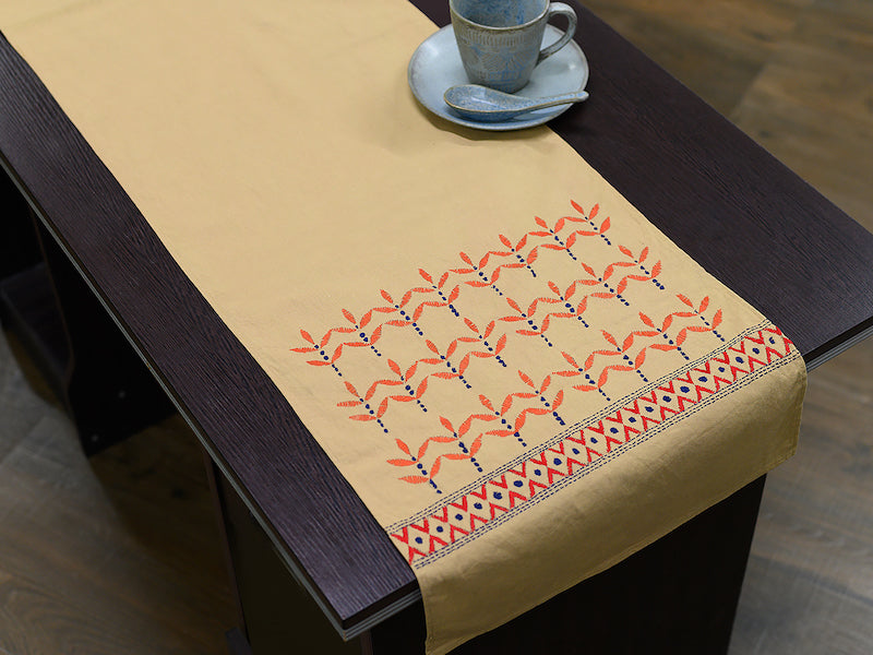 Update your dining table's look with this beige orange leaves embroidered table runner and mats. Crafted with hand kantha embroidery and featuring rural women artisans' work, this cotton runner will bring a sophisticated, tasteful feel to any space. Add an elegant touch to any occasion with this exquisite piece.
