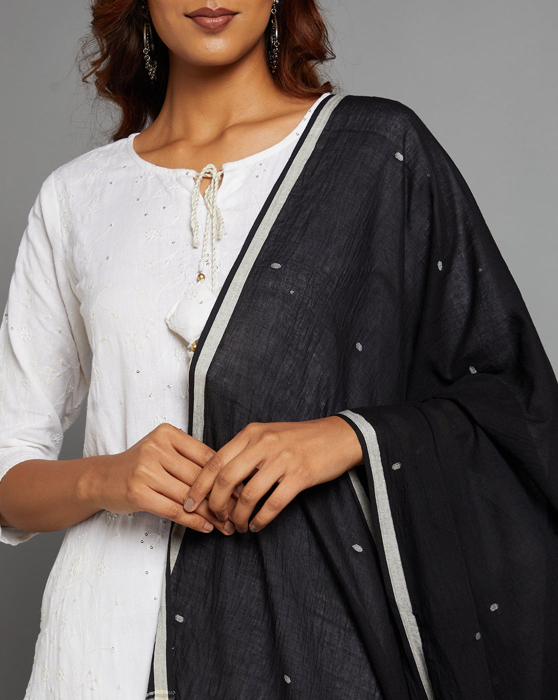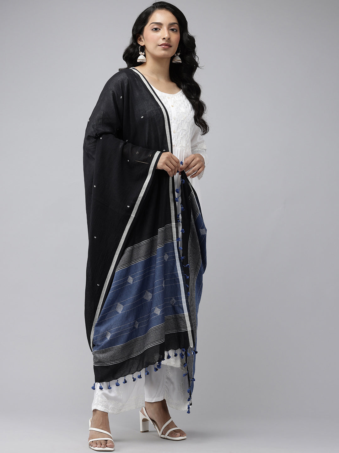 Indulge in the timeless elegance of our Black Blue Handloom Jamdani Cotton Dupatta. The intricate jamdani technique adds a touch of luxury, while the handloom cotton fabric ensures breathability and comfort. Complete with charming pompom details, it's the perfect accessory for any occasion.