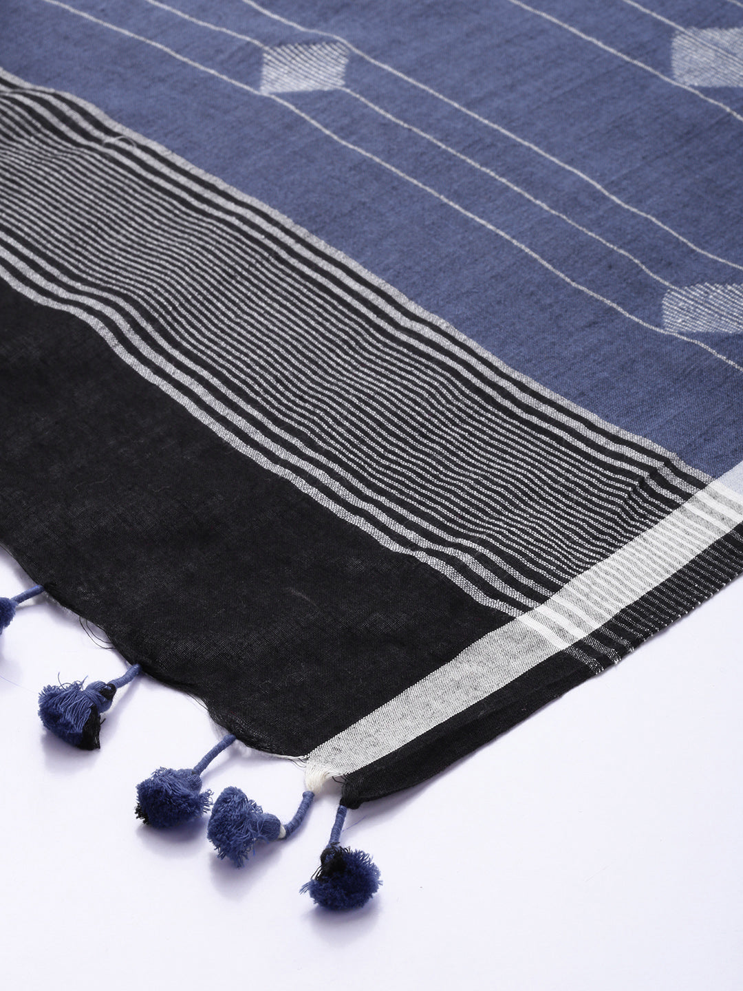Black Blue Handloom Jamdani Cotton Dupatta with Pompoms
