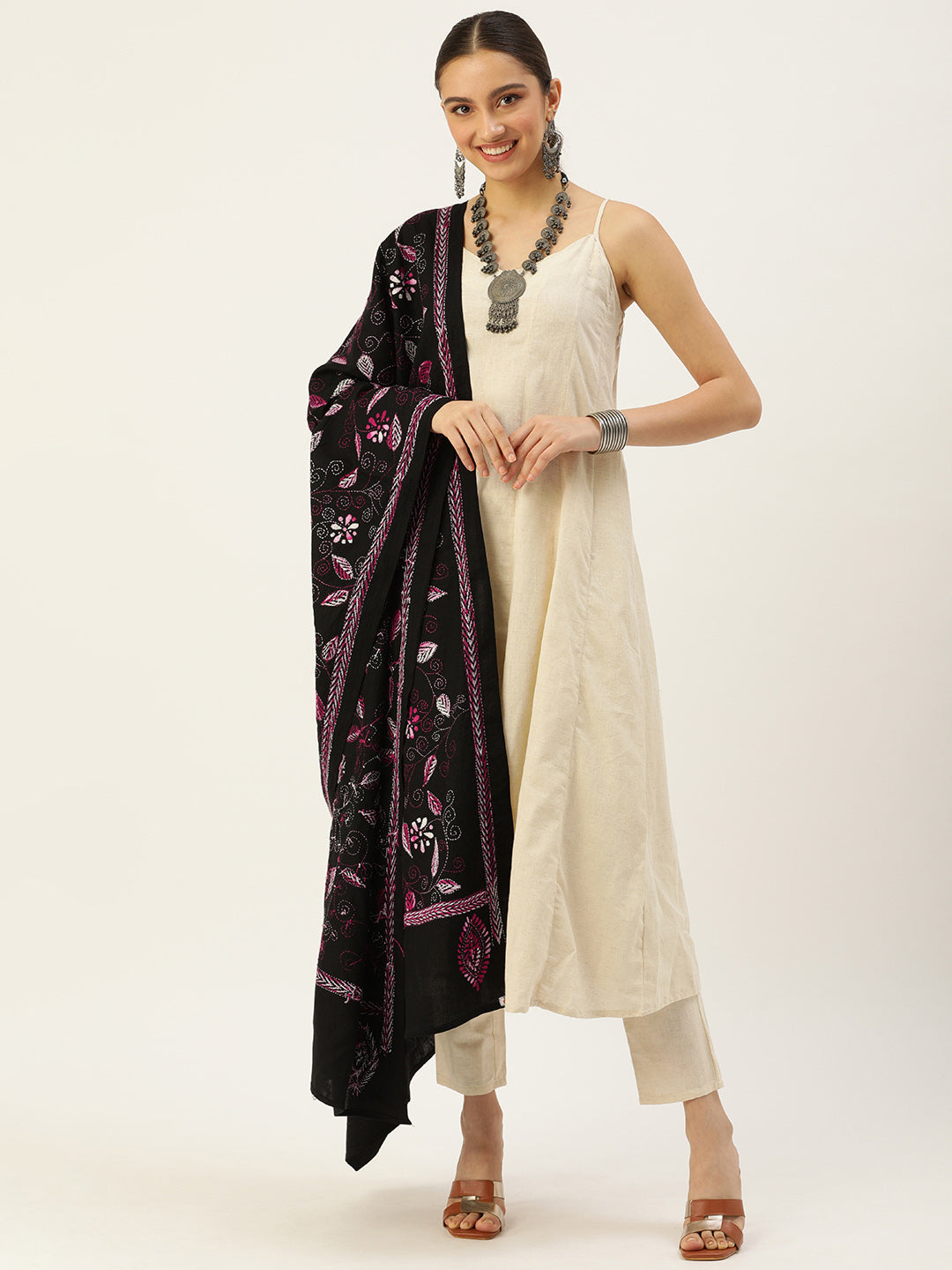 Black Mauve Kantha Stitch Cotton Dupatta