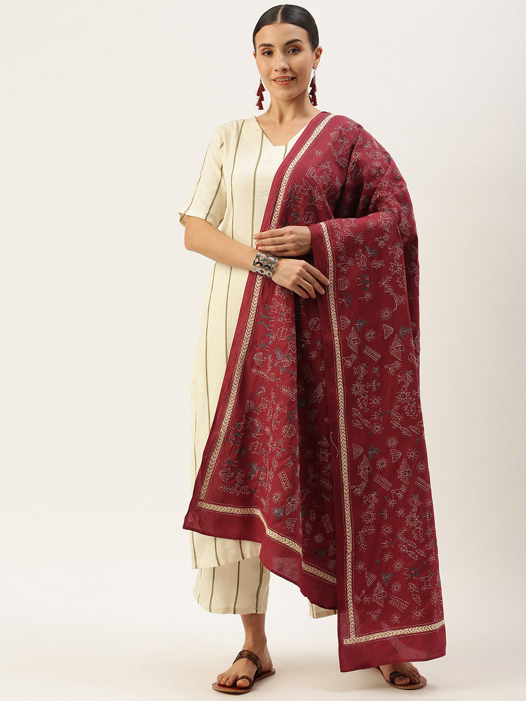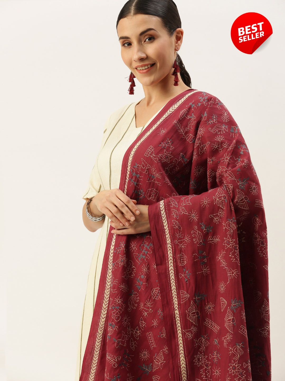 Beautiful Hand embroidered Black Worli Kantha Embroidered Cotton Dupatta. A perfect Fashion accessory to enhance your outfit.