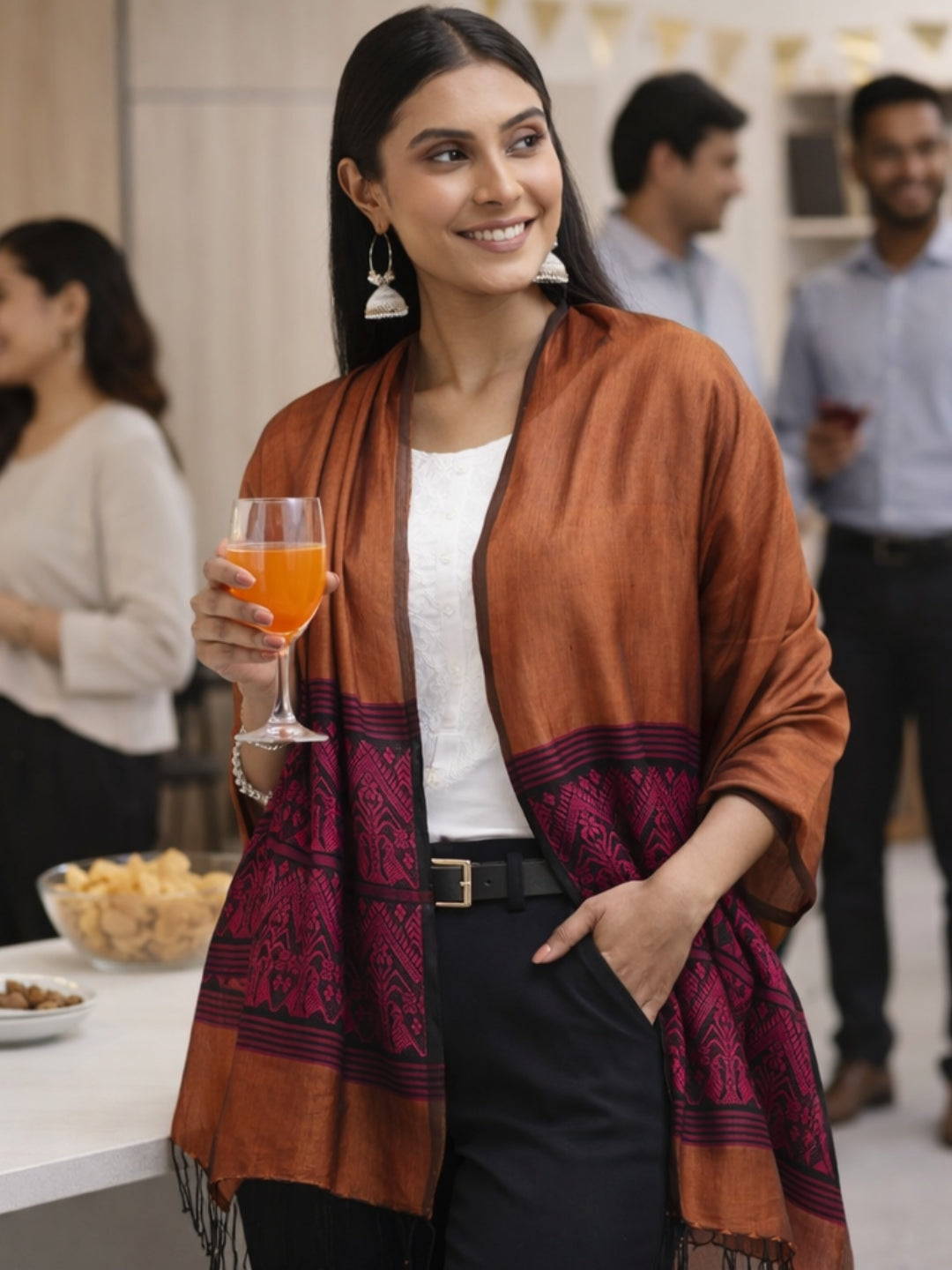Indulge in luxury with our Assamese dupatta, made from the finest silk cotton. Elegant and exclusive, this Copper & Magenta piece is a nod to the world of art and literature. Elevate your wardrobe with this one-of-a-kind piece and stand out in style.