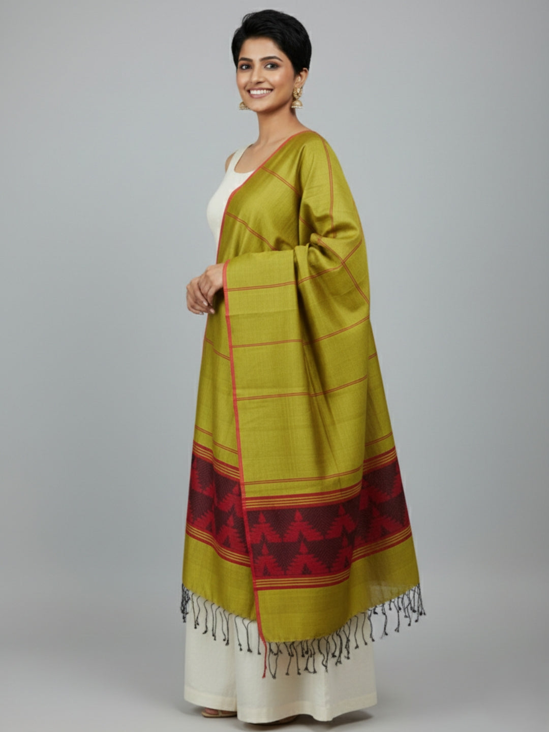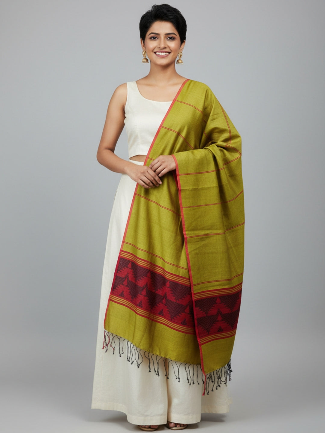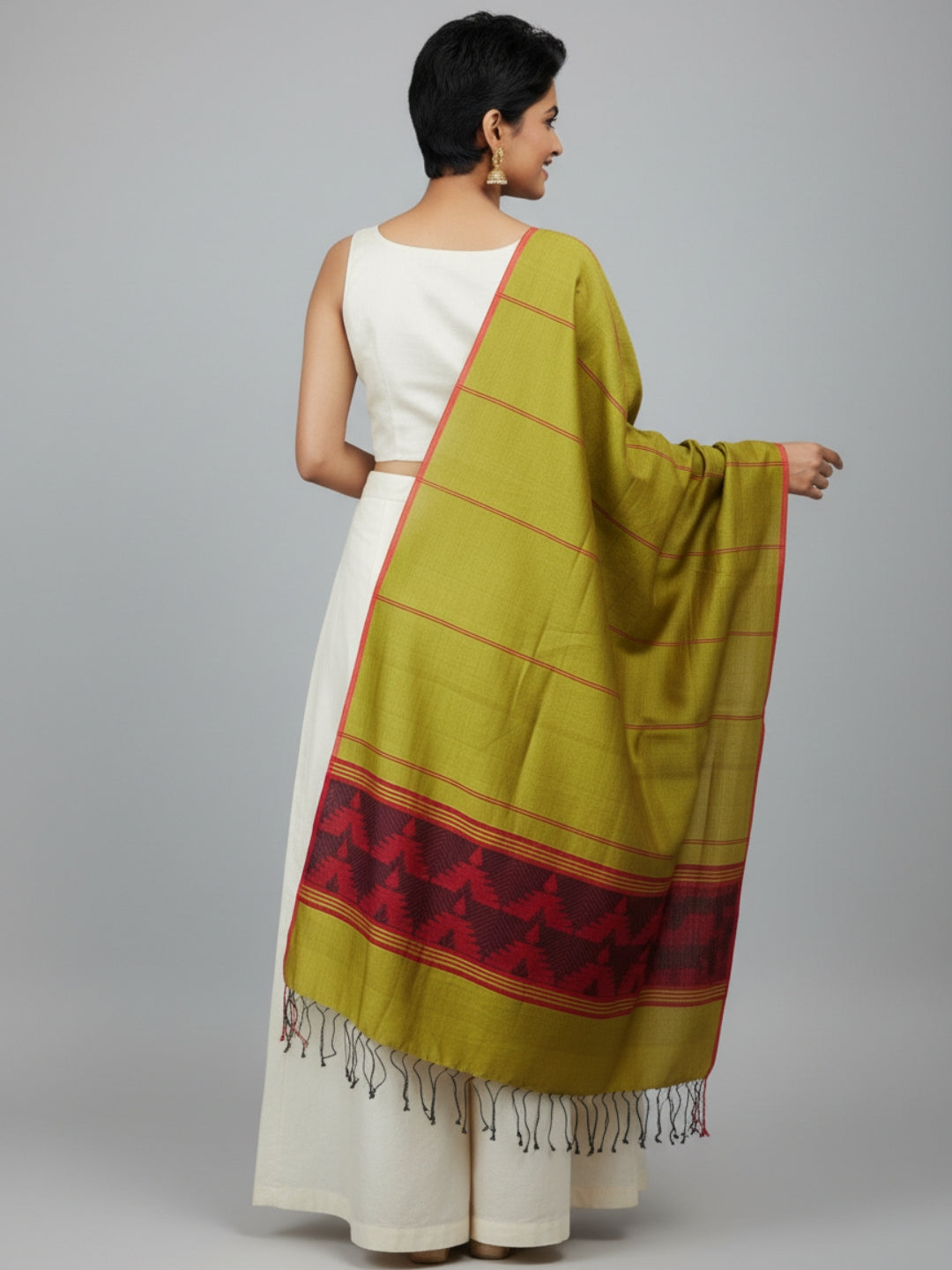 Become a connoisseur of art, by shopping online for authentic Handcrafted woven green, red Blended silk dupatta with tassles.