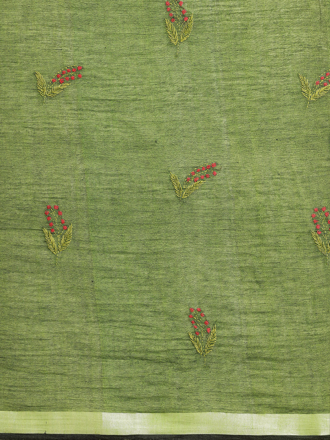 Green & Blue Multi Colourblock Handloom Cotton Kantha Stitch Saree