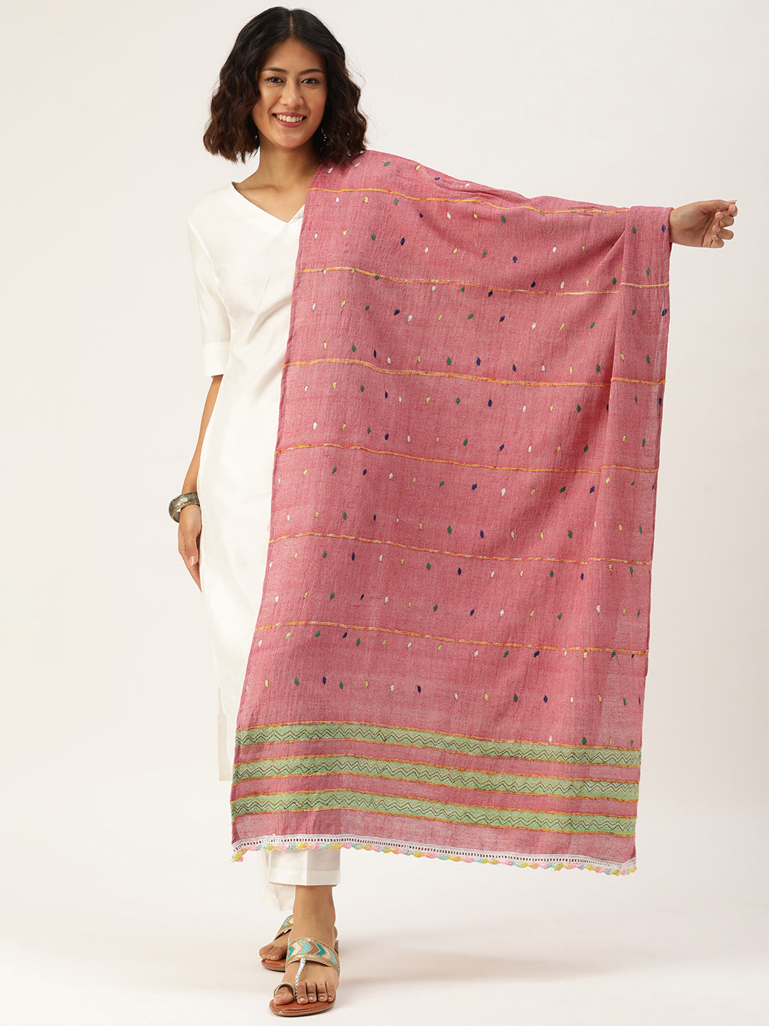 Introducing our Pink Khesh Kantha Cotton Dupatta! Add a pop of pink and a touch of khesh weaving to your wardrobe with our lightweight and vibrant dupatta. Perfect for adding a playful twist to any outfit. (No instructions revealed!)