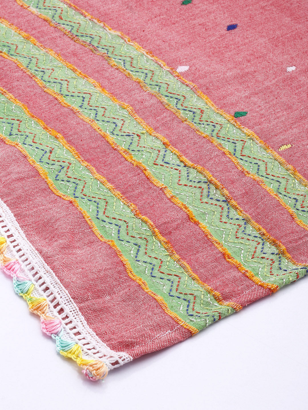 Khesh Kantha embroidery is done by hand and may result in differing colors and patterns in each piece in the collection due to work done by several artisans.