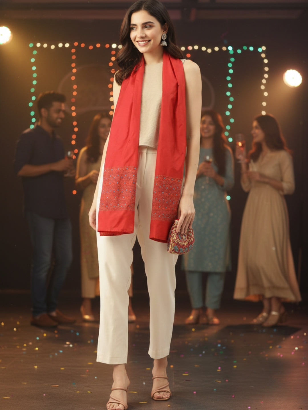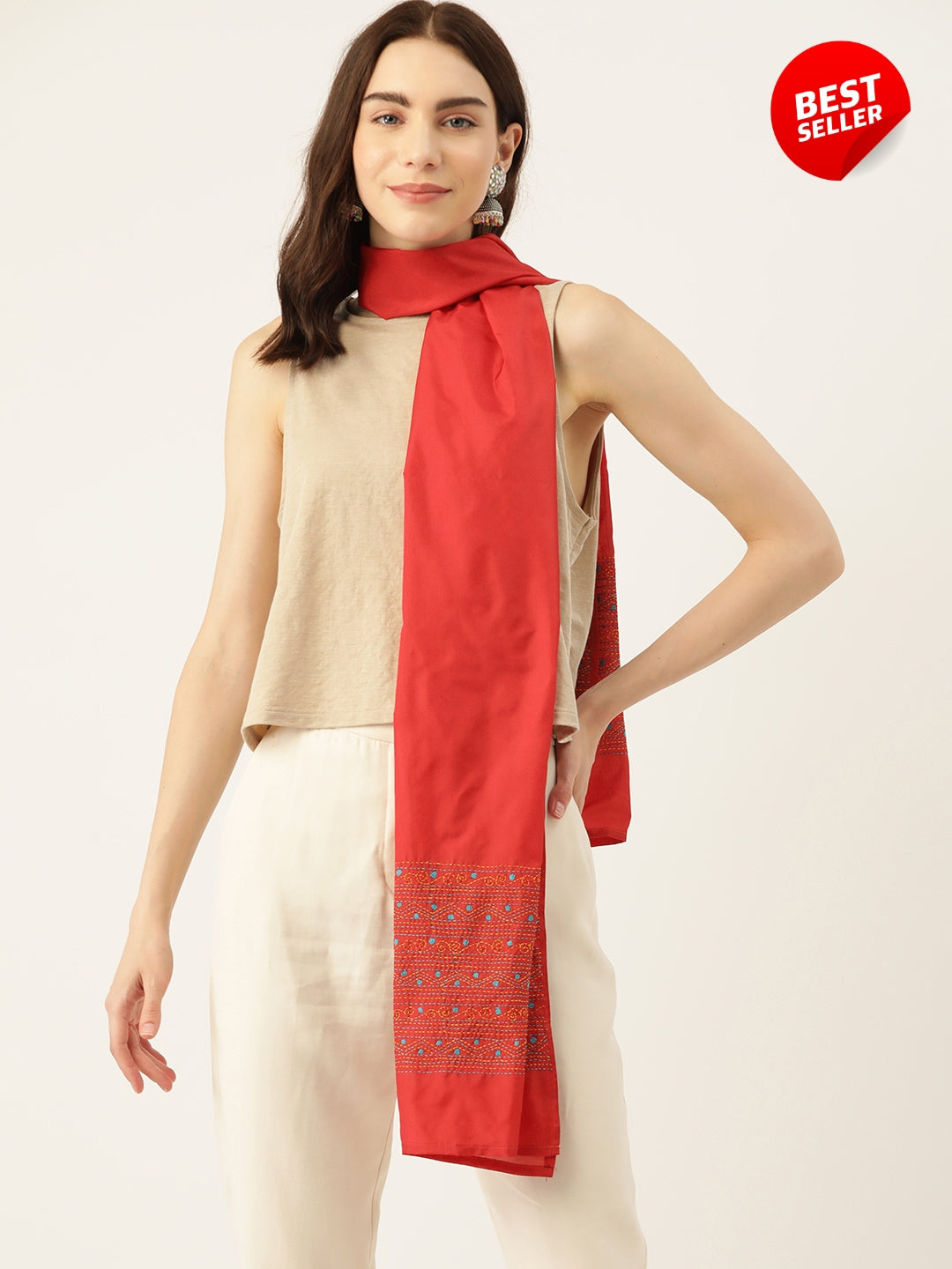 This exquisite red and yellow handcrafted kantha silk stole offers a modern yet traditional look. The luxurious silk fabric is intricately decorated with kantha work, a traditional Indian embroidery technique, ensuring a durable and stylish accessory. Perfect for a special occasion or to add a hint of color to any outfit.