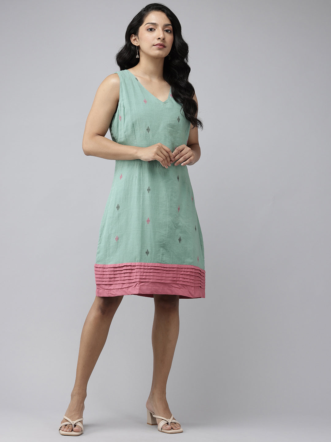 Indulge in effortless style with our Sea Green Pink Cotton Handloom Dress with.  Designed with a relaxed...