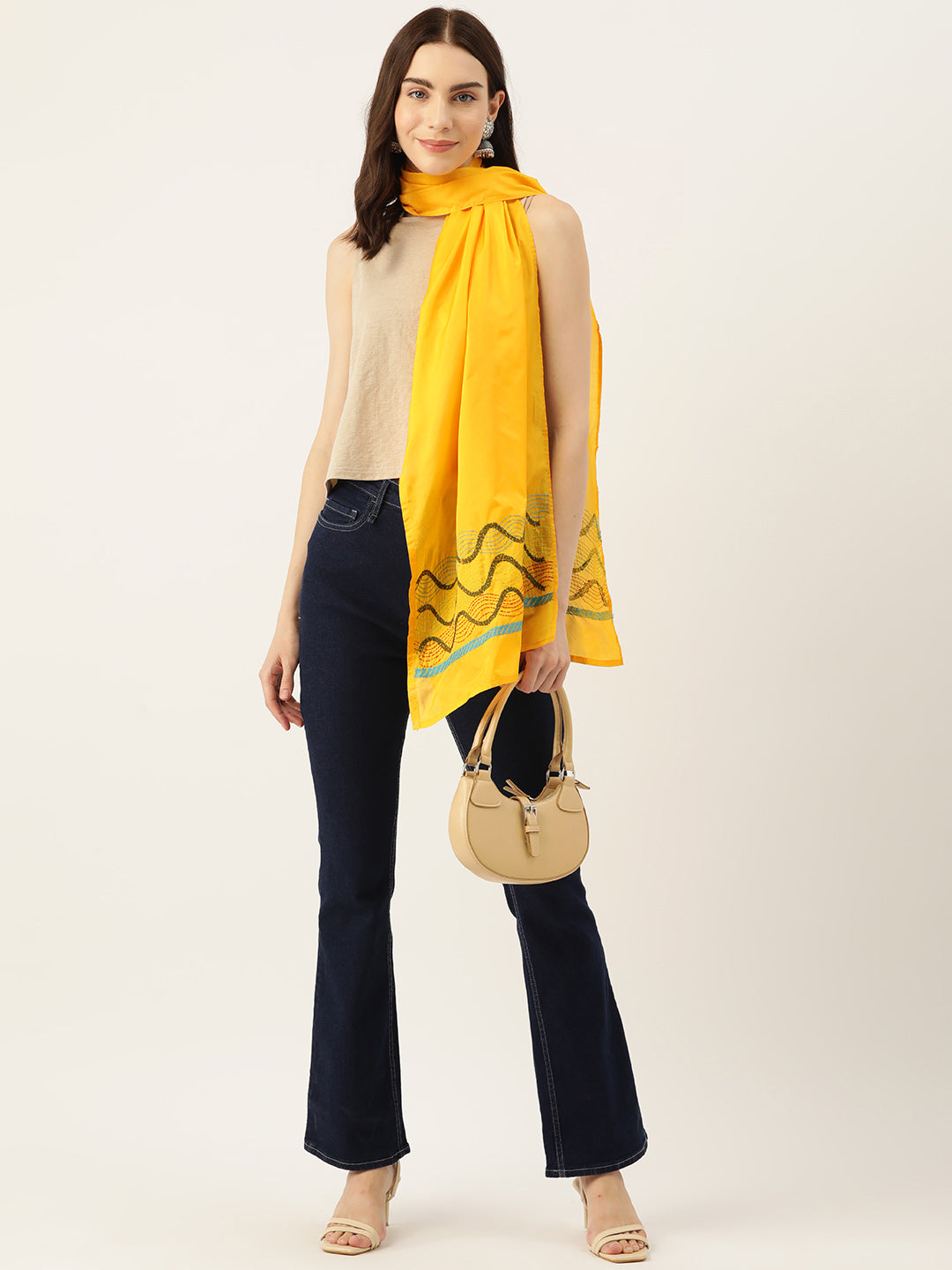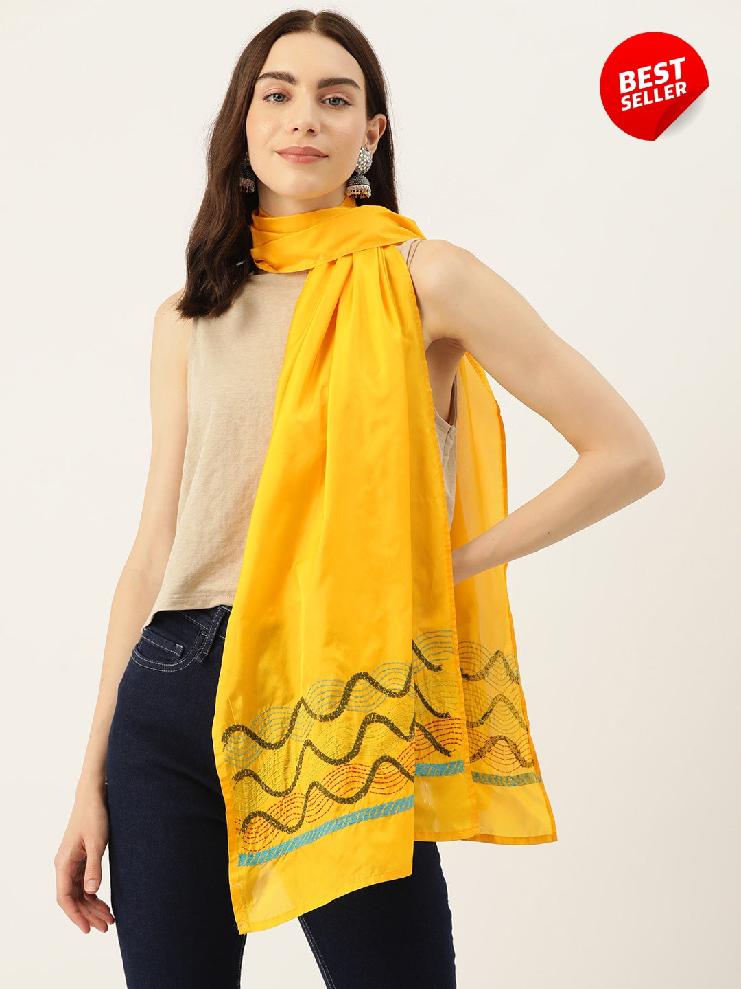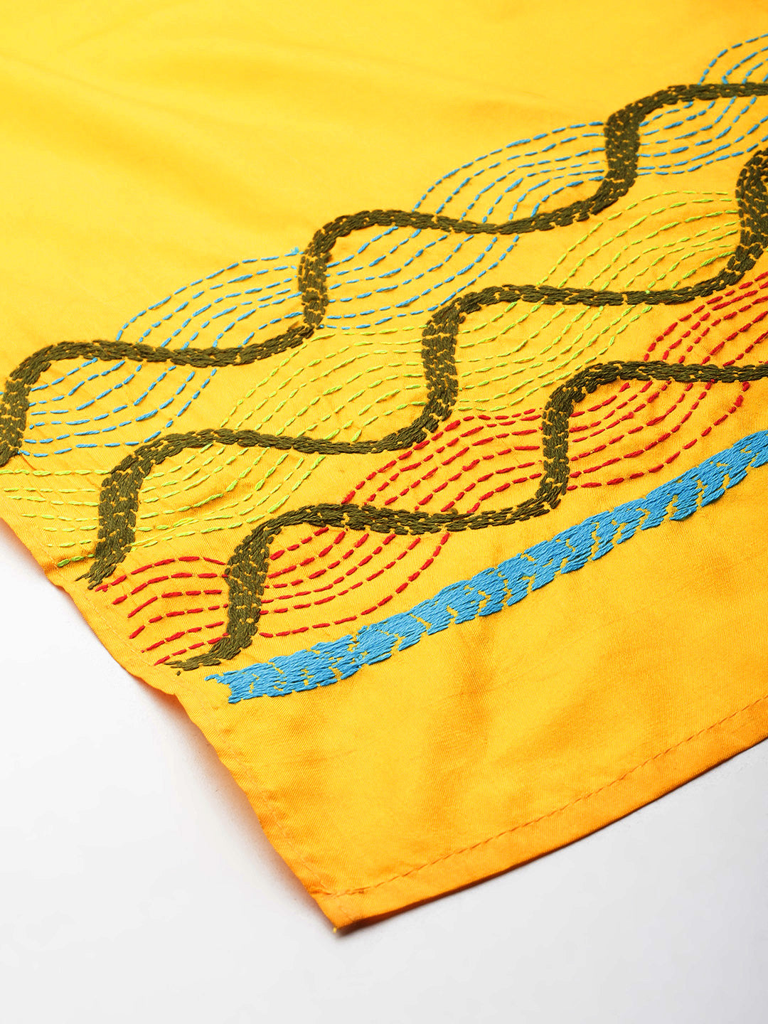 Make a style statement with this cheerful yellow and green handcrafted embroidered artsilk stole. Featuring exquisite kantha work, this stole is handcrafted by rural Bengal artisans, bringing joy to your wardrobe and to the lives of the women artisans.